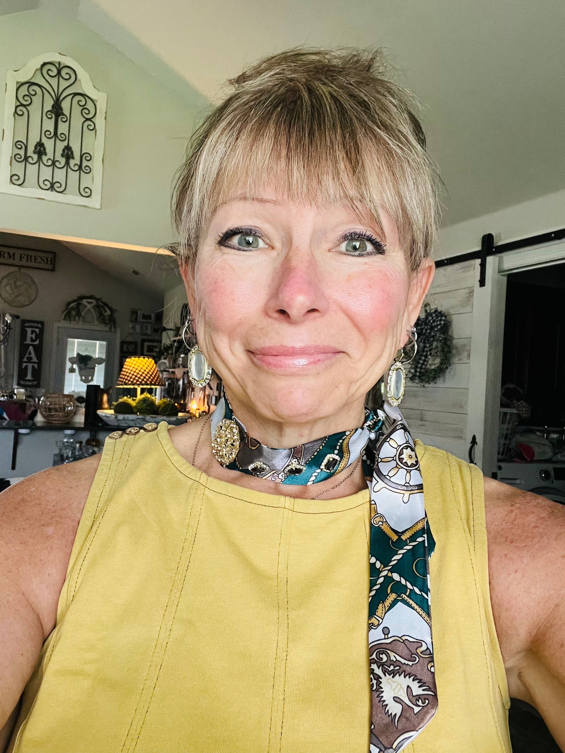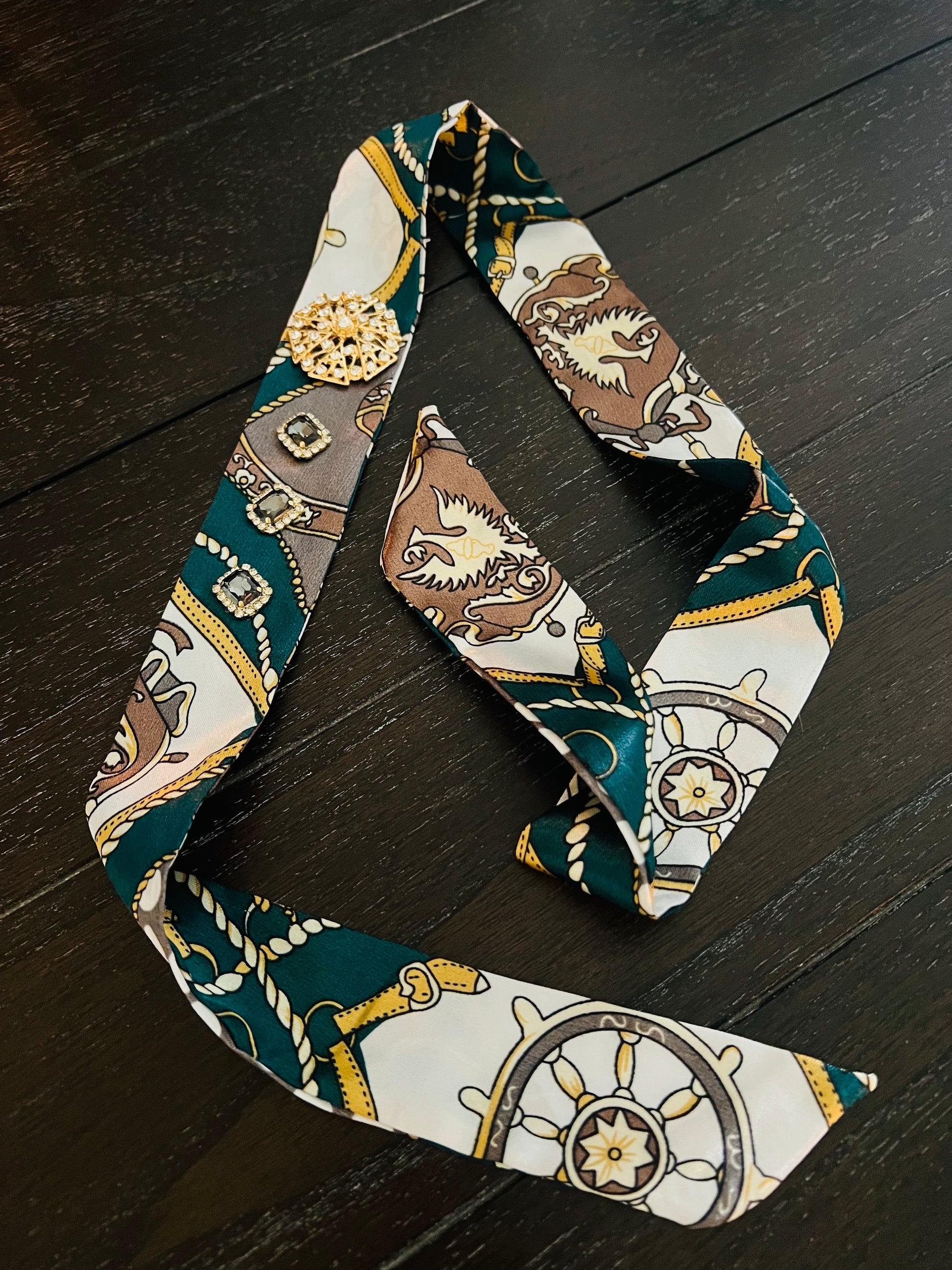 Silky scarf with 3 rhinestones and a brooch. This is so soft around the neck.