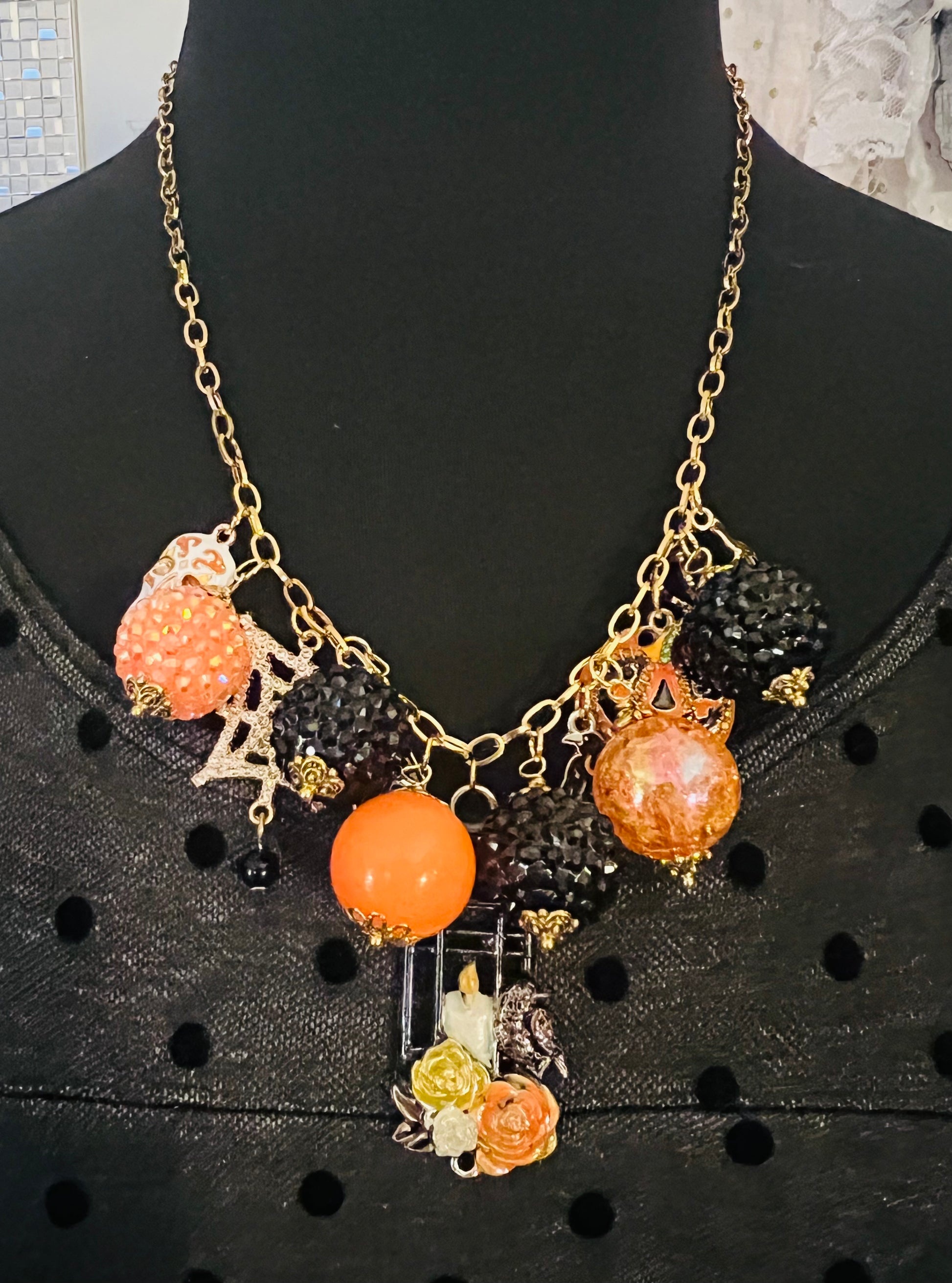 Golden Stainless-Steel chain, with a lobster claw closure, with a hand painted lantern with a candle and pumpkin and raven pendant, bubble bead drops, blinged out spider webs, pumpkin, raven, and skeleton charm.