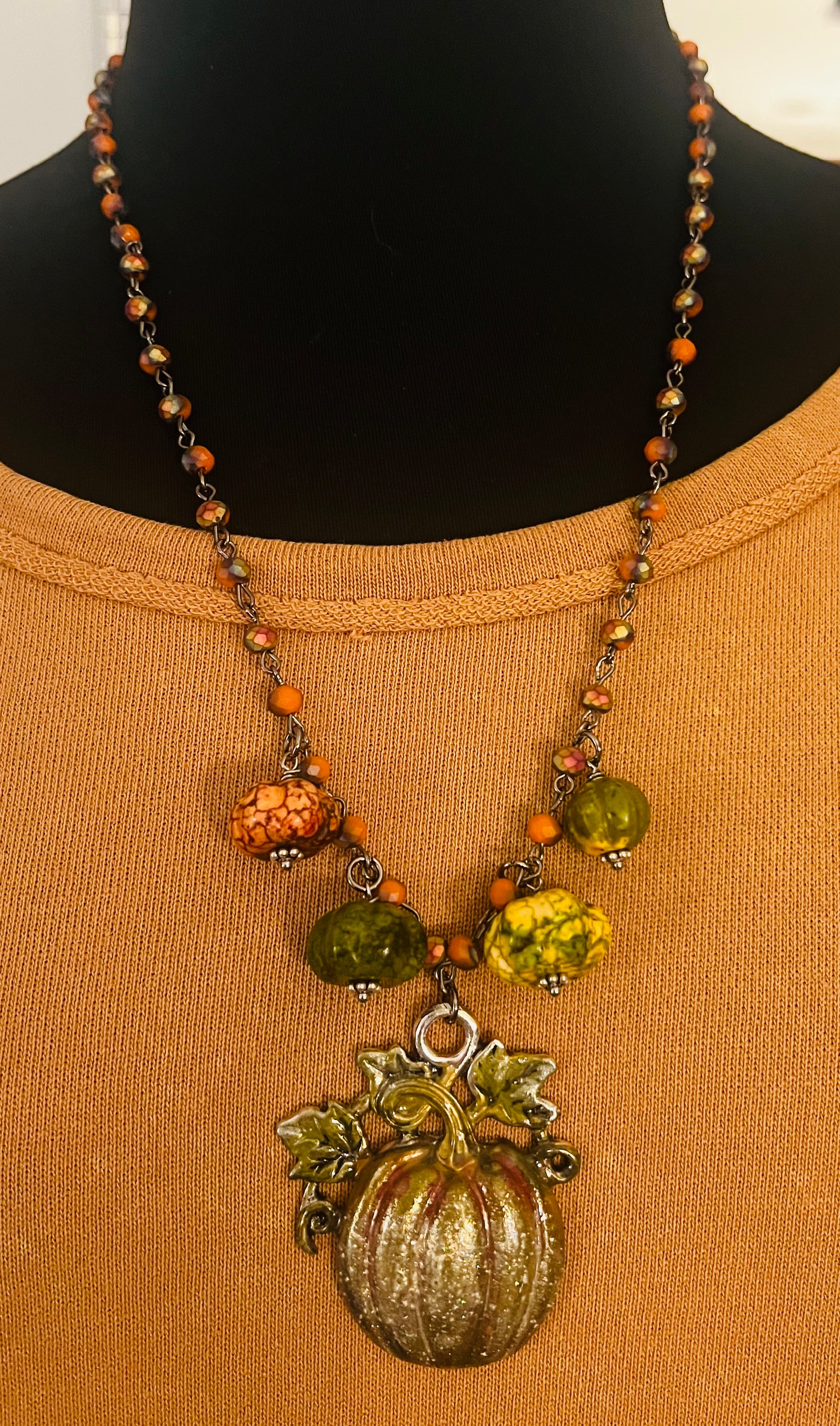 Fall colored beaded chain with a hand painted pumpkin pendant and 4 pumpkin bead drops, with a lobster claw closure,